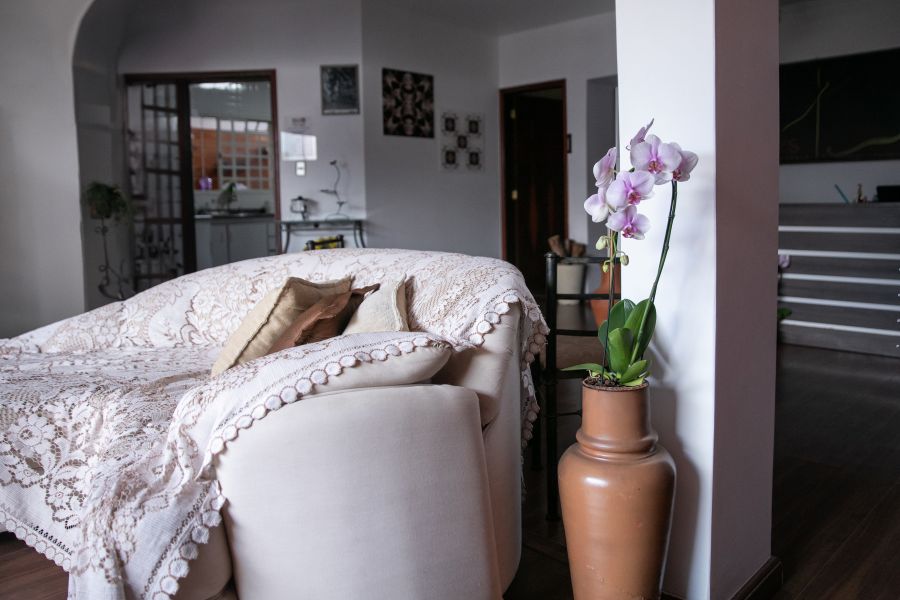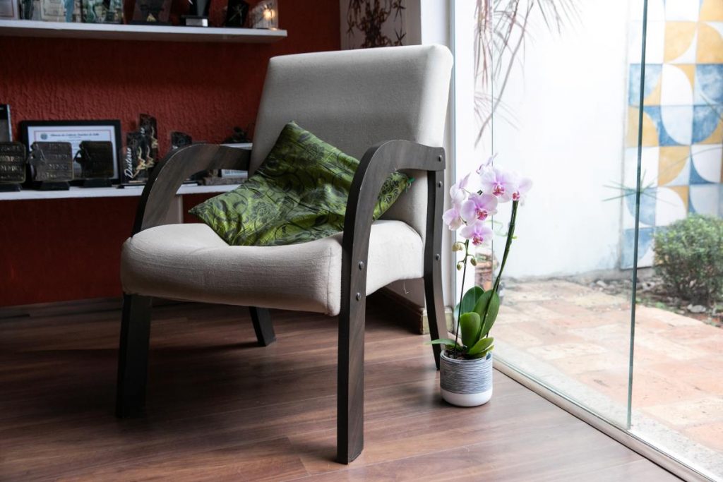 Aquela poltrona gostosa para relaxar e ler um bom livro (ou tirar um cochilo após o almoço!) também fica linda com uma orquídea ao lado. Geralmente, estes espaços são bem iluminados e, portanto, excelentes para sua Phalaenopsis ficar!